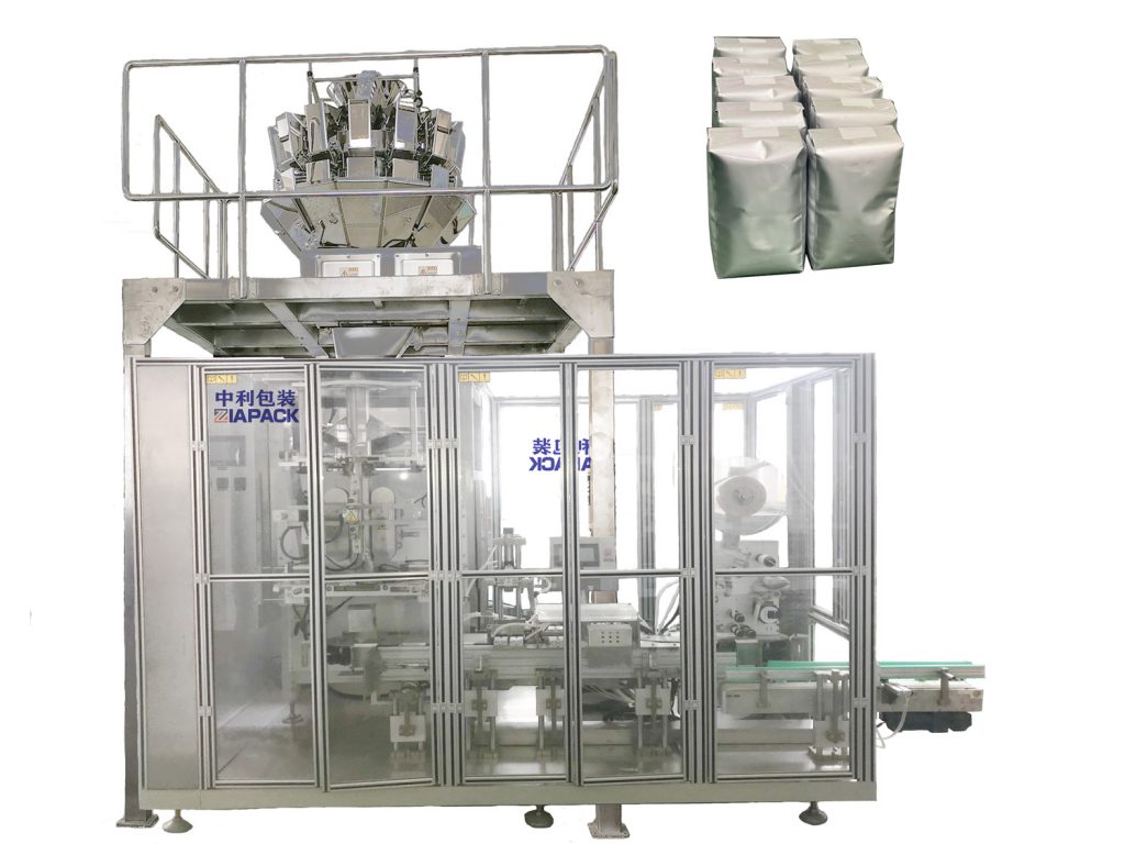 Cijela linija uključuje jedan set vffs stroja za brtvljenje za oblikovanje vrećica, jedan set gornjeg stroja za pakiranje vrećica s naljepnicama, jedan set uređaja za provjeru težine i transportne trake međuspremnika i jedan set stroja za omatanje termoskupljajuće folije. Cijeli stroj može automatski završiti vaganje zrna, oblikovanje vrećica i brtvljenje naljepnica i savijanje. Postoji dodatna opcijska funkcija za vakuum vrećice koja se može dodati na ovaj jedinični stroj.