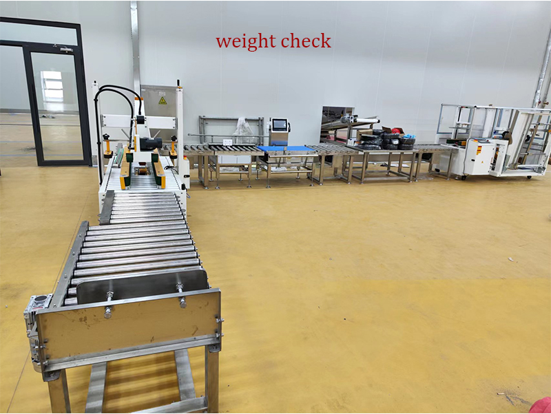 Nakon punjenja vrećica smrznutom hranom, svaka se vrećica ponovno provjerava detektorom težine kako bi se osiguralo da težina odgovara ciljanoj težini, a zatim prolazi kroz detektor metala kako bi se osiguralo da u svaku vrećicu nije umiješan metal. Vreće se zatim transportiraju do linije za punjenje kartona.