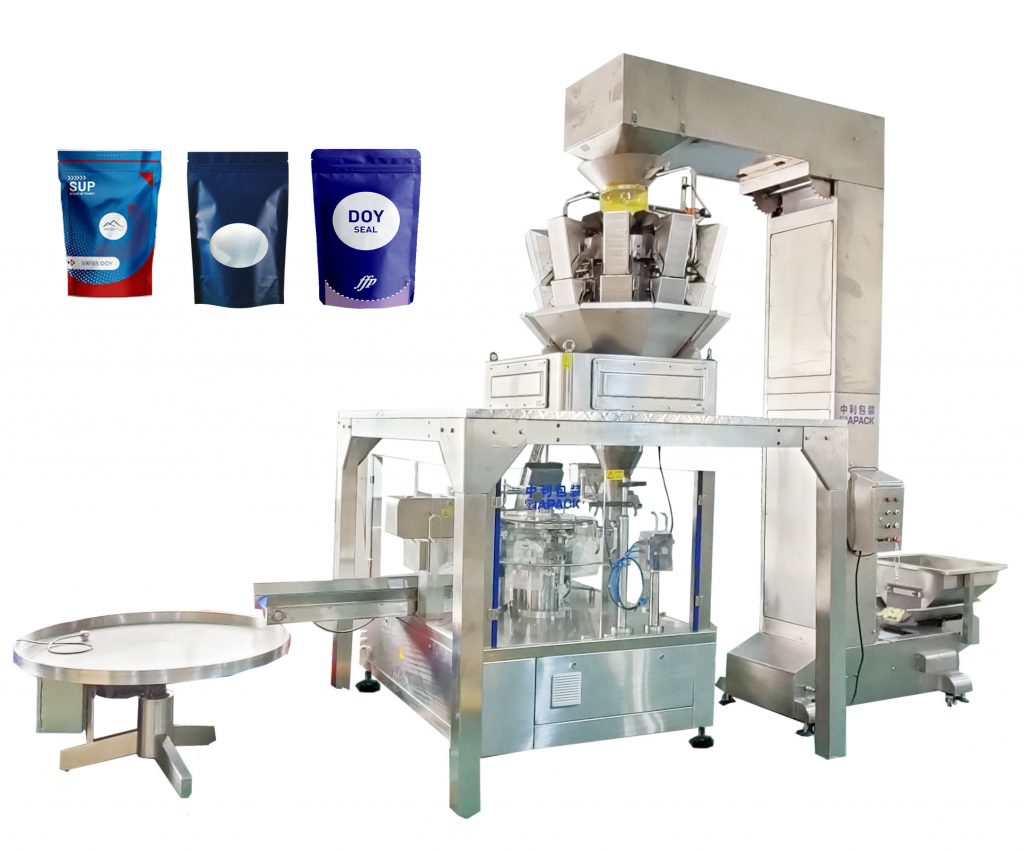 Predinstalirani stroj za punjenje i brtvljenje vrećica, koji se sastoji od 8 radnih stanica učinkovitosti i stabilnosti, naglašava paket vrećice, torbicu za zatvaranje, vrećicu za izlijevanje i različite predgotovljene vrećice. Surađivao je s različitim sustavima doziranja (kombinirani vagati / linearni vage / vijci klipa / punjač klipa) i automatske podizne transportere, široko se primjenjuje na granule, tekućinu i prašak.