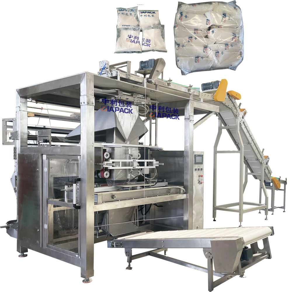 Ovaj stroj je prikladan za pakiranje male vrećice u veliku vrećicu. Stroj može automatski izraditi vrećicu i napuniti malu vrećicu, a zatim zatvoriti veliku vrećicu. Ovaj stroj uključujući jedinice za rezanje:
